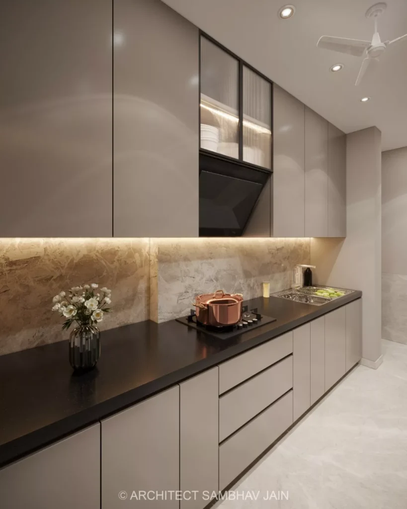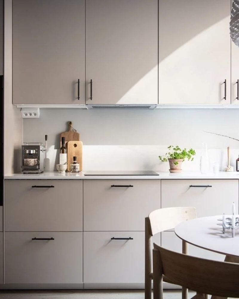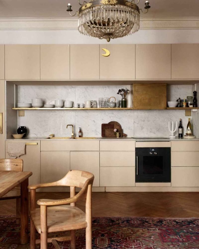 Minimalism doesn’t have to mean “empty.” Use flat-panel beige cabinets for a sleek, handle-less look. Add a single statement light fixture or a marble slab to keep it from looking plain. It’s clean, it’s calm, and it’s very easy on the eyes.