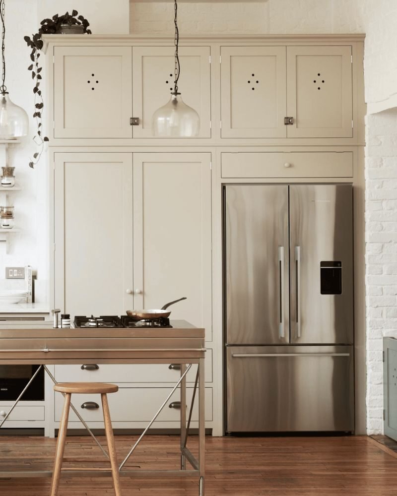 Want to mix old-school and new-school? Put a stainless steel island in the middle of your beige shaker cabinets. The industrial metal against the soft paint color creates a “cool chef” vibe that’s hard to beat.