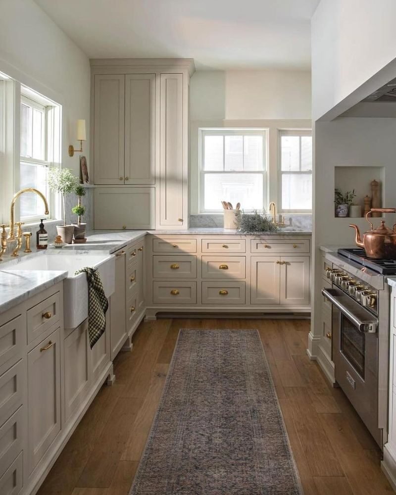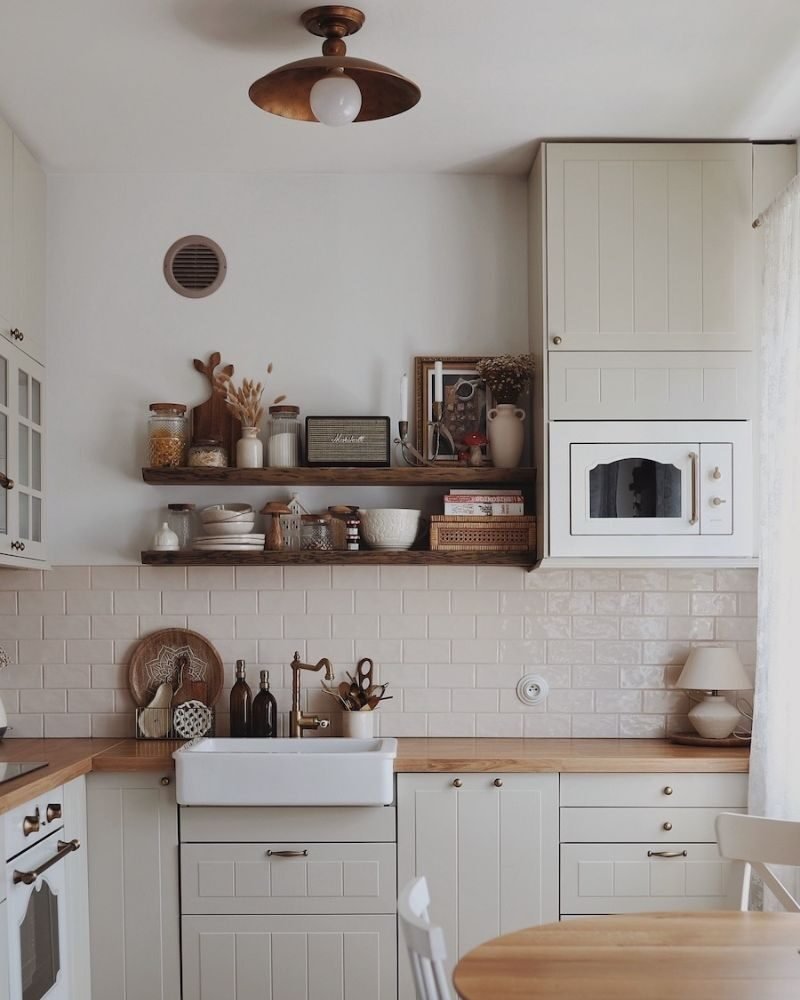 If you have a historic home (or just want it to look like one), match your cabinets to the door trim. Add a brass faucet and some floating wood shelves. It feels intentional, cozy, and very “English cottage.”