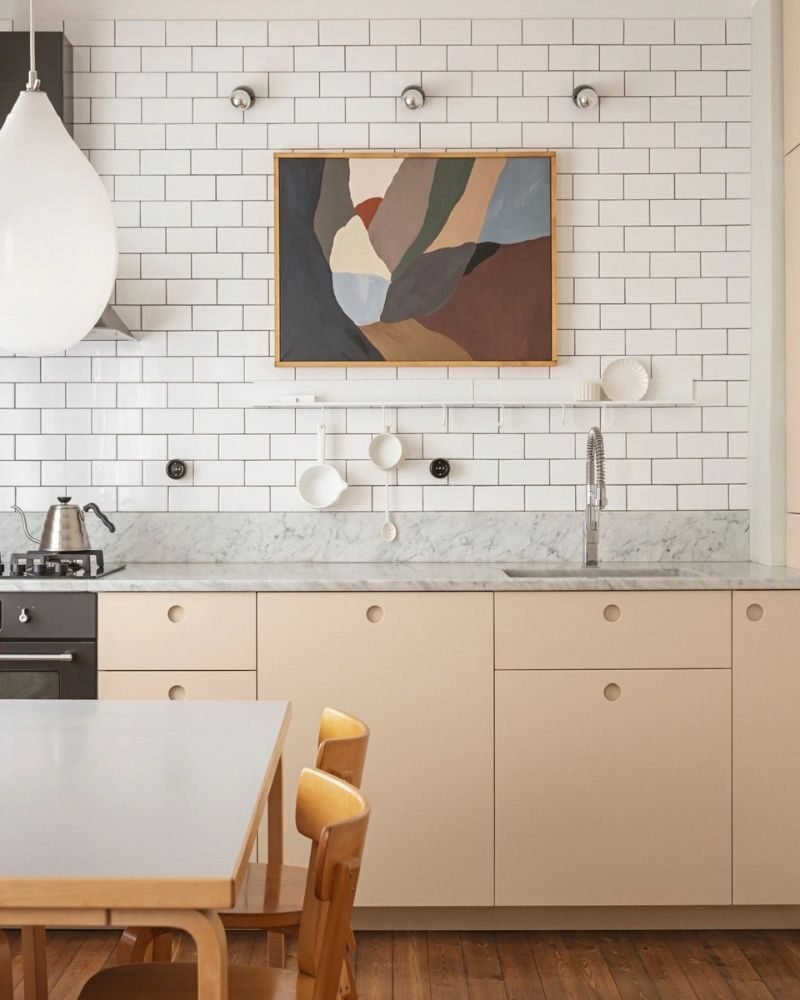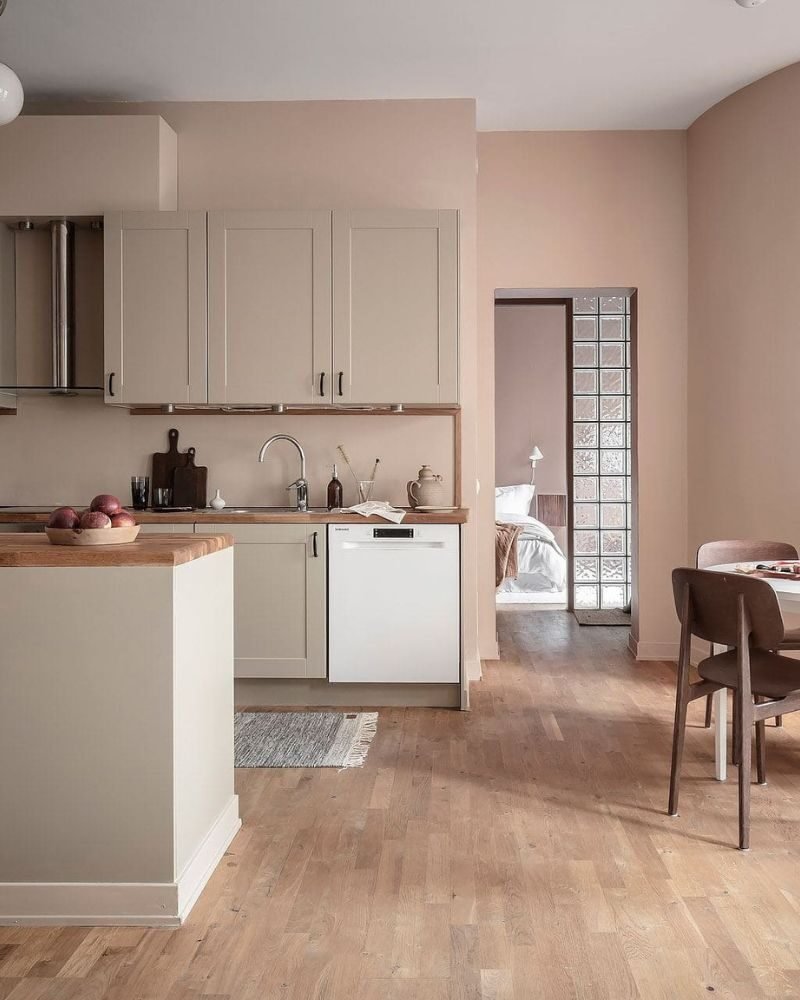 Okay, hear me out: Pink and beige. It sounds like a nursery, but with a muted “dusty rose” and warm beige cabinets, it’s actually incredibly sophisticated. The wood counters keep it grounded so it doesn’t feel too sugary.