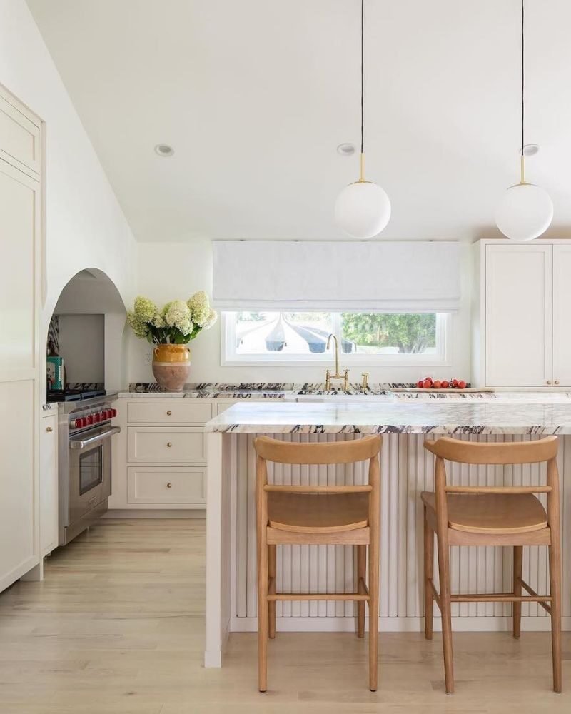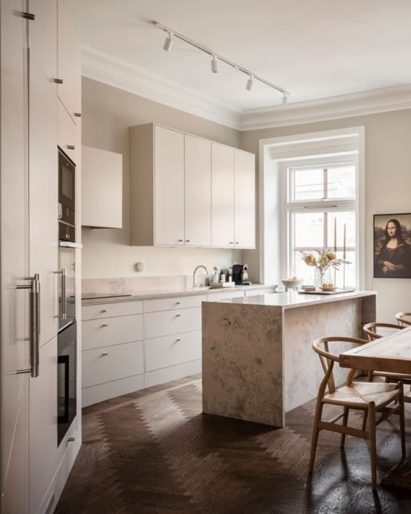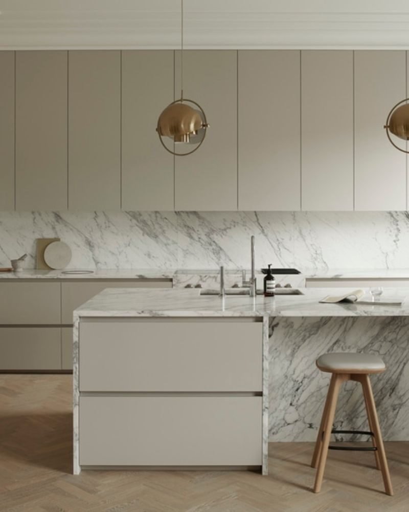 For a modern masterpiece, go with handle-less beige cabinets and a waterfall marble island (where the stone continues down the sides). It’s dramatic, expensive-looking, and creates a seamless flow that’s perfect for open-concept living.