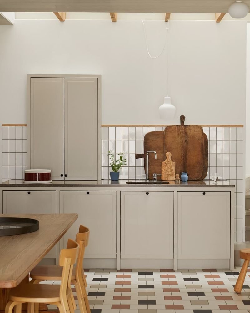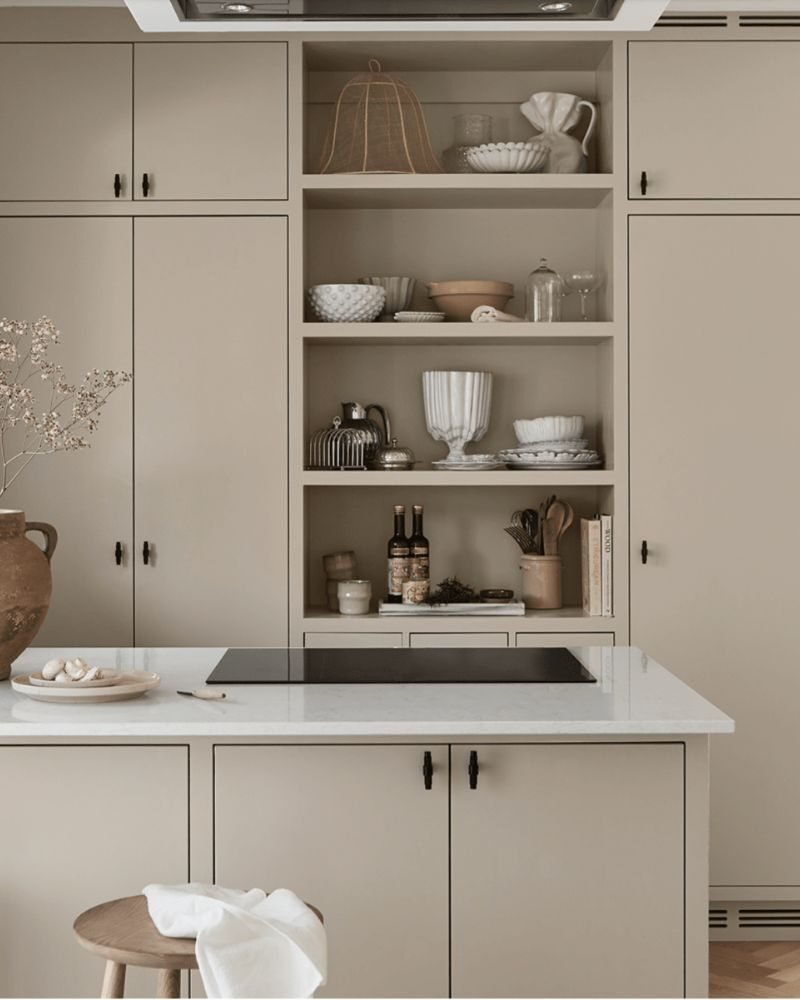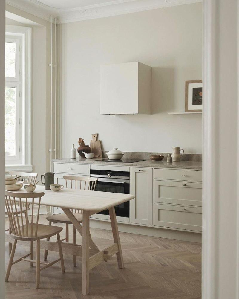 If true beige feels too yellow for you, try greige (grey-beige). Pair it with black hardware and quartz counters for a look that’s modern but still has a soul. Toss in a vintage wood table to keep it from feeling too cold.