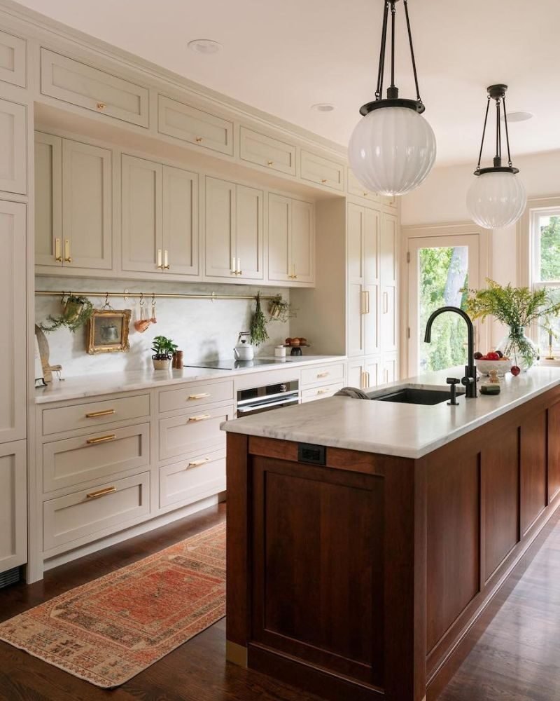 Beige on beige can sometimes feel like a desert landscape. I love adding walnut wood—maybe a chunky island or some floating shelves—to add some much-needed “visual weight.” The dark wood makes the beige pop rather than disappear.