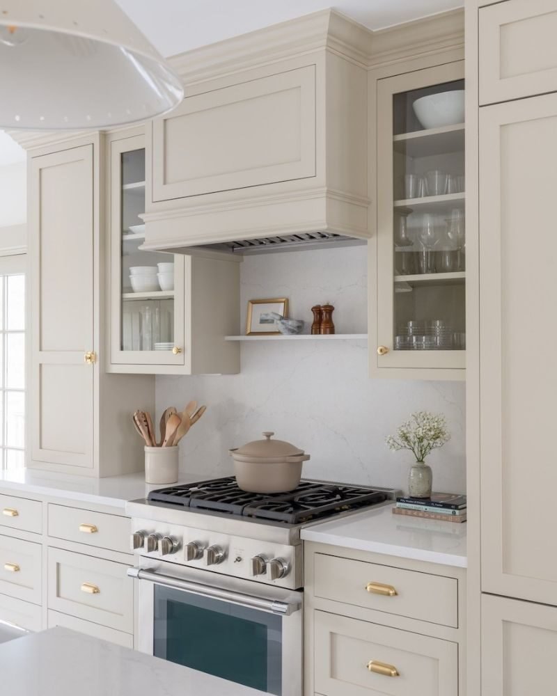 For a truly “designer” look, pair your beige cabinets with a brass range hood and white marble countertops. The marble brightens the space, while the brass acts as a focal point that screams “I hired a professional.”