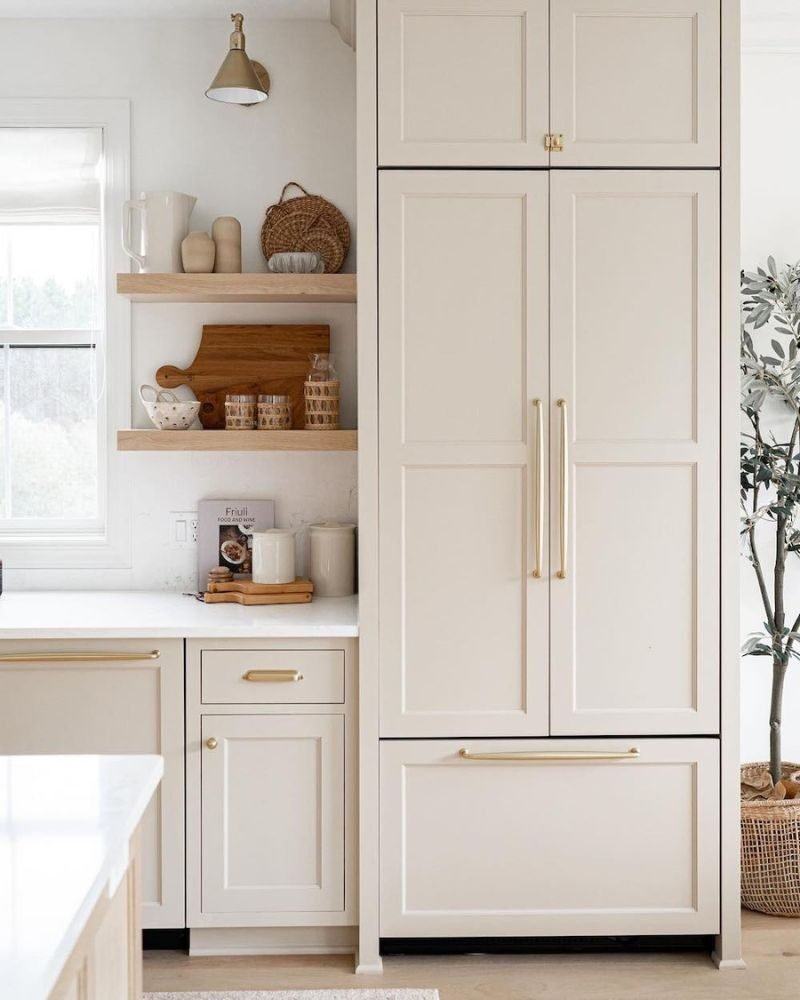 If you’re not afraid of a little dusting, open shelves are a game changer. They stop beige cabinets from feeling too “heavy” or boxed-in. Use them to display your favorite ceramics or that one plant you’ve managed to keep alive.