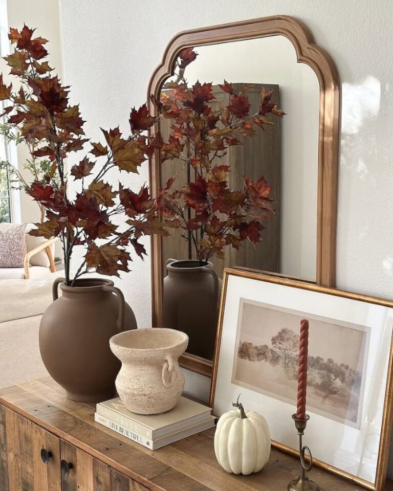 The entryway is the “first impression” of your home, and usually, mine is just a pile of shoes. You can fix the vibe in ten minutes flat. Swap out the random summer junk for a few dried leaf bouquets and some moody, tall candles. Stick to rust, deep greens, and warm browns. It tells people, “I have my life together,” even if the rest of the house says otherwise.