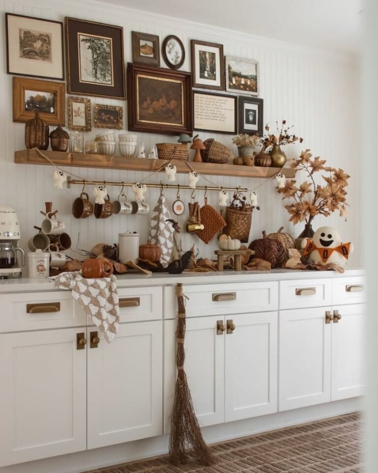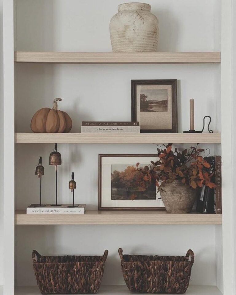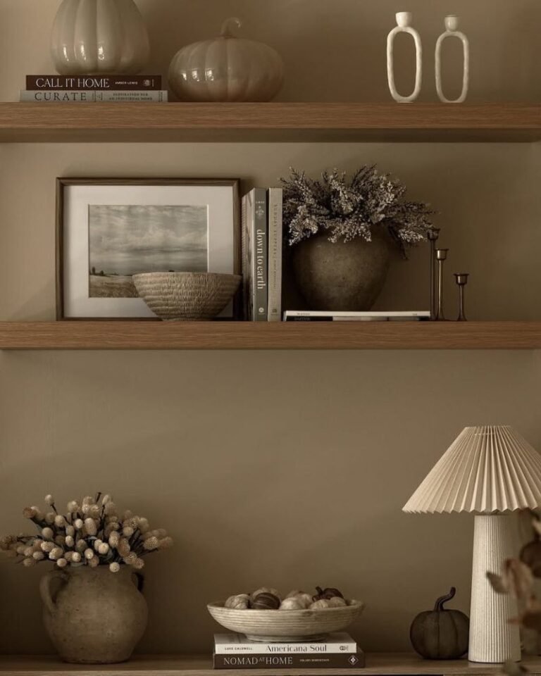 Shelves are the sneakiest place to add personality. Mix brass accents with rustic pumpkins and different textures like wood or soft fabrics. These layers make your home feel “curated” rather than just “decorated.” Plus, it’s incredibly easy to swap these out when the winter holidays eventually roll around.