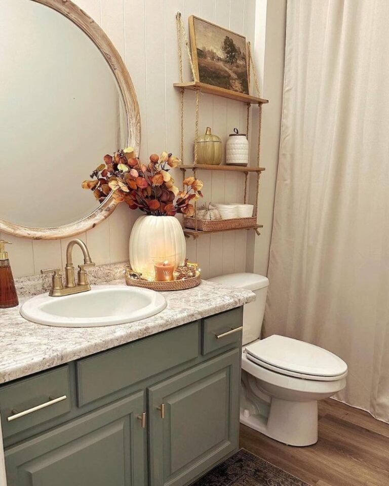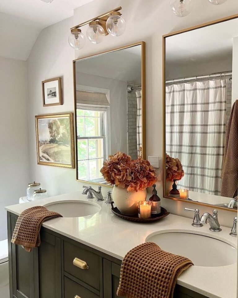Bathrooms are the most underrated spot for seasonal decor. Ditch those bright, beachy towels for some copper or olive-toned ones. Tuck a small golden bouquet in the corner of the vanity and light a spicy apple candle. Suddenly, your morning routine feels less like a chore and more like a spa day in a forest. 🙂