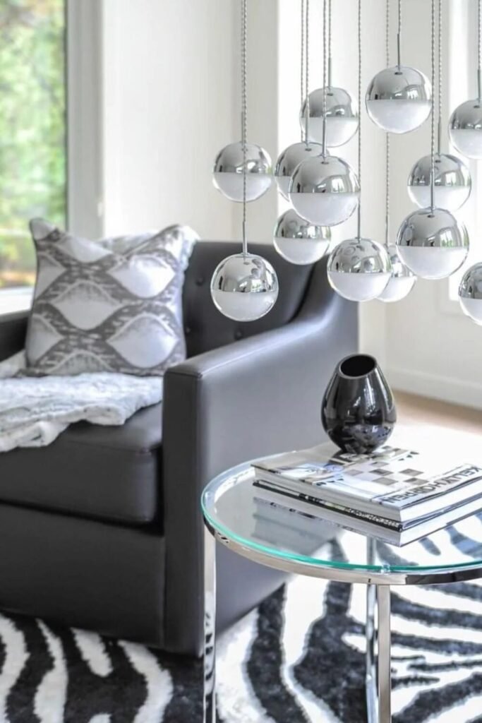 If you want “Space Age meets disco,” go for chrome. Use metallic hanging lights and pair them with a zebra rug. The shiny surfaces bounce light around, making even a black-and-white palette feel energetic rather than cold.