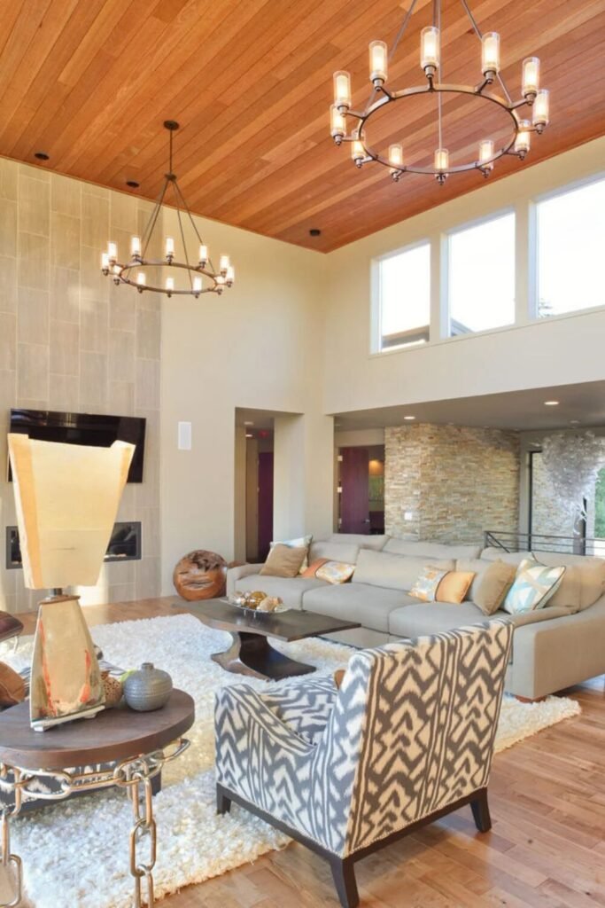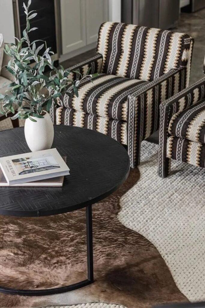 You can be funky and “grounded” at the same time. Try brown chairs with bold zigzag patterns. Use a thick knit rug to add layers. It feels like a modern tribal retreat, keeping things interesting without blinding your guests.