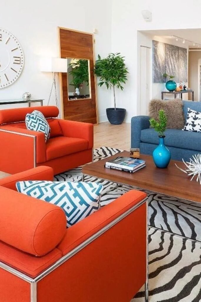 Stop worrying if blue and orange go together. (Spoiler: They do.) Throw a blue sofa next to an orange chair, toss a zebra rug underneath, and call it a day. Funky design isn’t messy; it’s intentional bravery.
