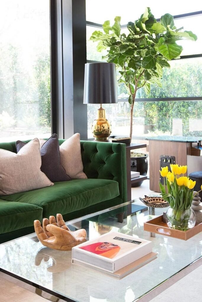 Velvet makes everything look expensive, but we’re keeping it weird. Grab a deep green velvet sofa and pair it with something unexpected—like a gold hand-shaped sculpture. It’s fancy, but it doesn’t take itself too seriously.