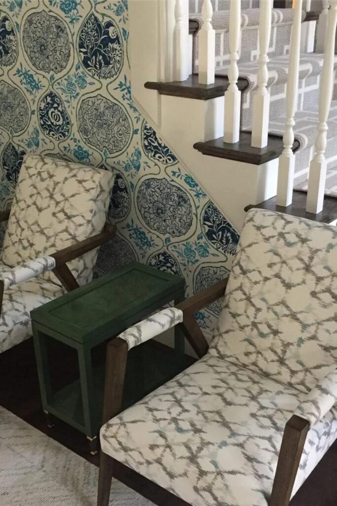 Mid-century modern chairs already have great bones, so why not give them a wild outfit? Put them against busy blue wallpaper. The contrast between the vintage furniture shape and the loud walls is a total chef’s kiss.