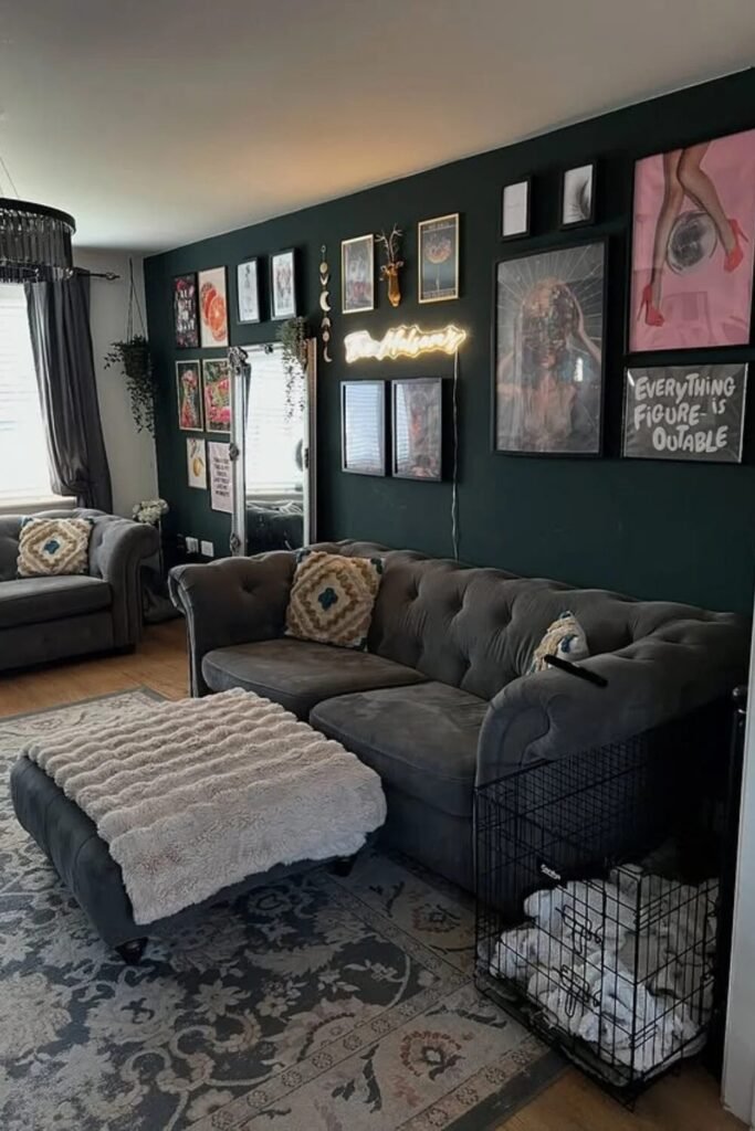 A dark green wall is the ultimate backdrop for a gallery. Mix neon signs with traditional framed photos. The “city-style” vibe thrives on these layers—it tells people you actually have hobbies and a personality.