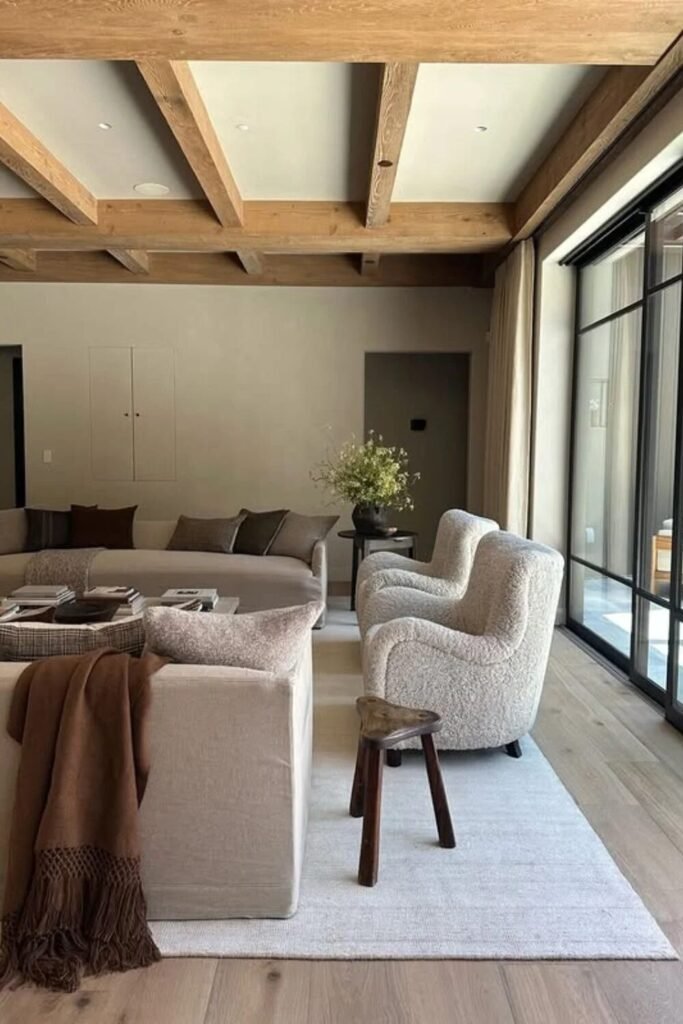 Can beige be funky? Yes, if you use the right materials. Think massive boucle chairs and exposed wooden beams. The “funk” comes from the touchable textures rather than the color palette.