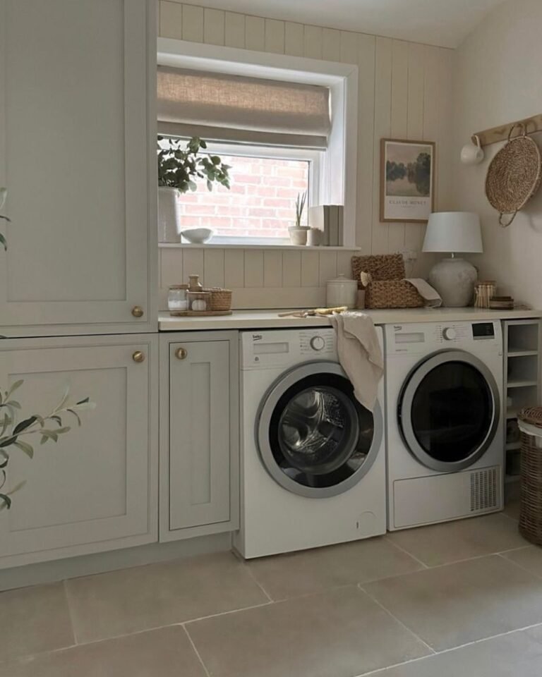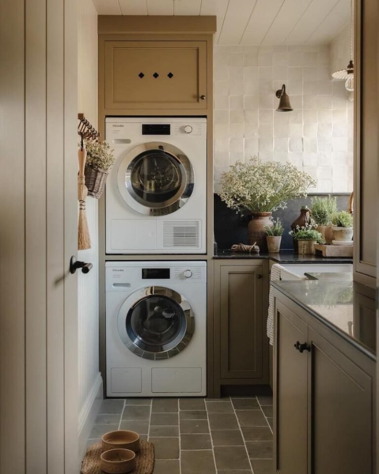I’m obsessed with the “lived-in” look. Think warm taupe walls, stone floors, and vintage vases. It feels less like a chore factory and more like a cozy corner of a manor. If you can’t move to the Cotswolds, this is the next best thing.
