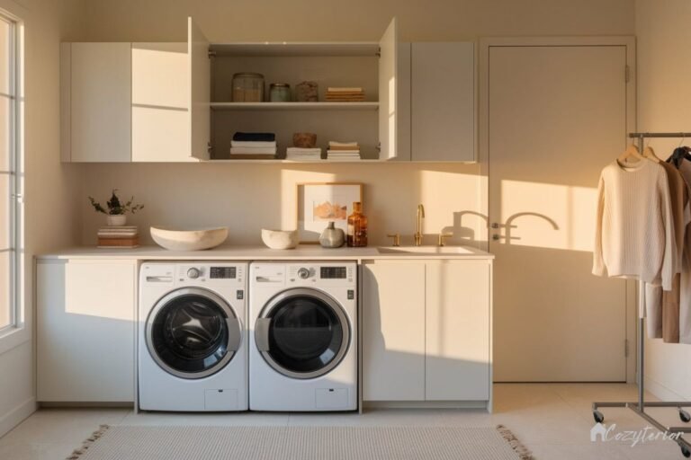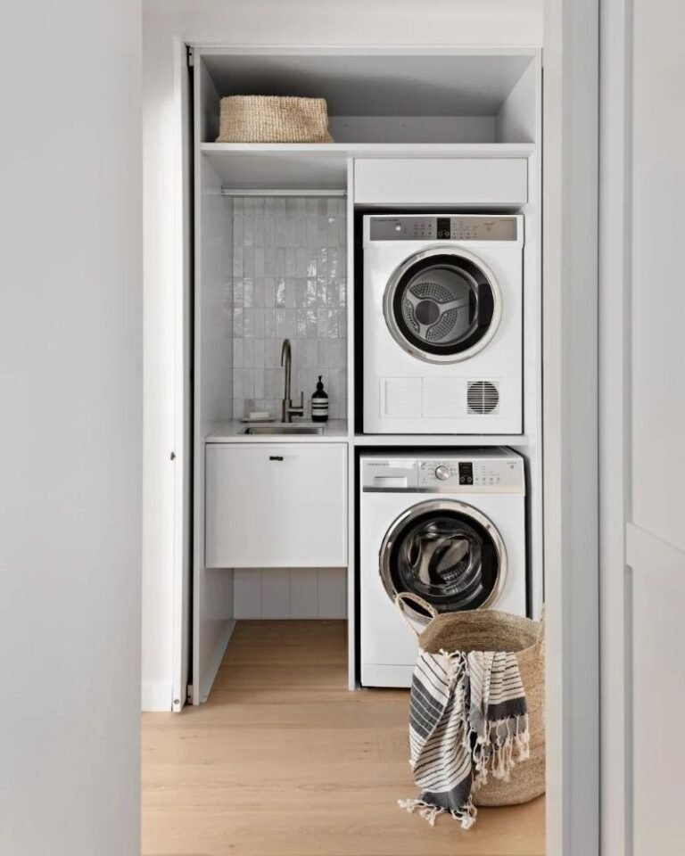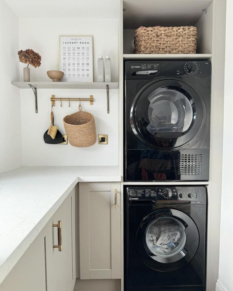 Stacking your washer and dryer is the ultimate space-saver. Keep the counters clear and hang a cheeky “Laundry Guide” frame on the wall. It’s sleek, efficient, and very “adult.”