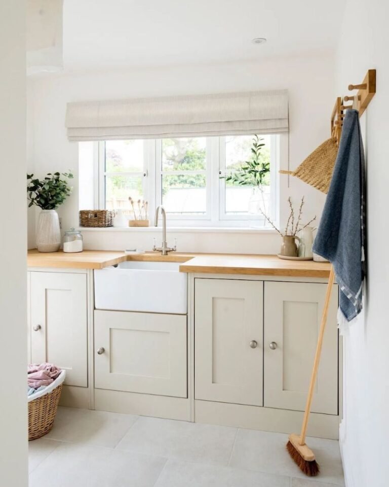 If you have a window, use it! Natural light makes chores feel 50% less soul-crushing. Use white walls and a butcher block counter to keep the vibe bright and natural.