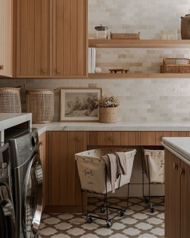 Beaded oak cabinets and woven baskets bring so much texture. It feels homey and refined. It’s the kind of room where you might actually enjoy folding towels. (Okay, maybe not enjoy, but you won’t hate it).