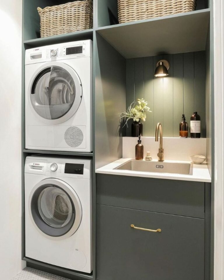 Dark green cabinets look incredibly expensive. In a tiny laundry corner with a stacked unit, this color adds a ton of depth and “main character” energy.