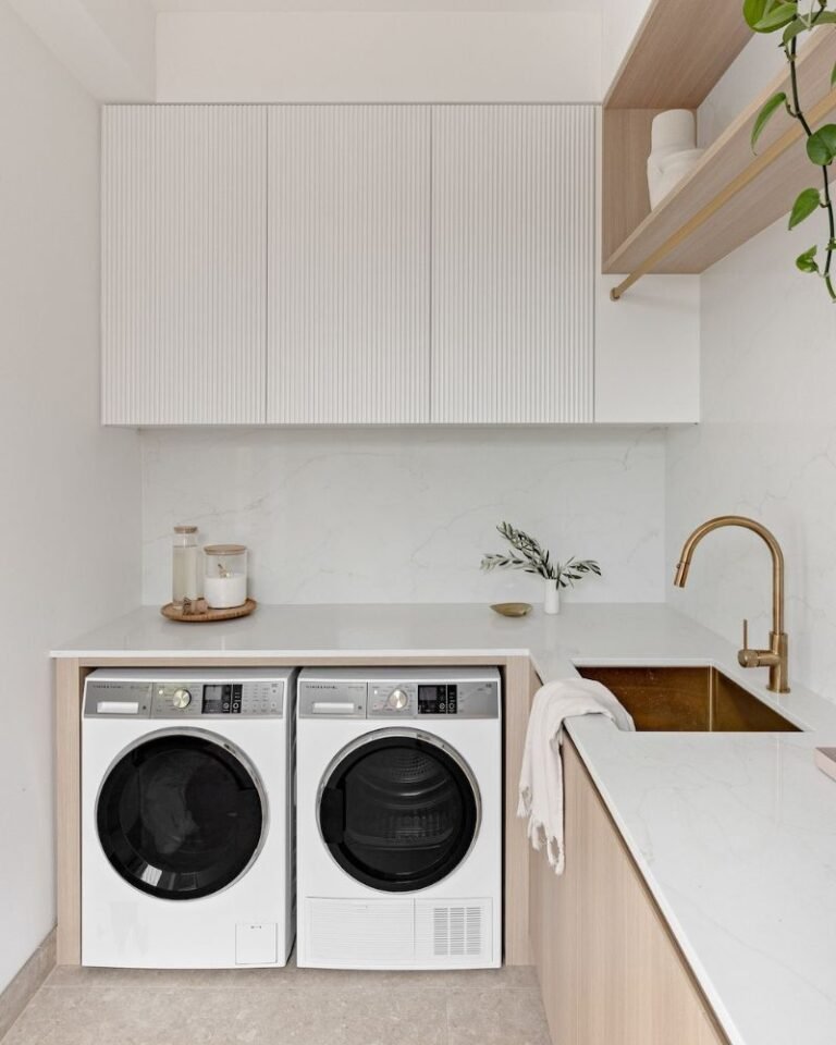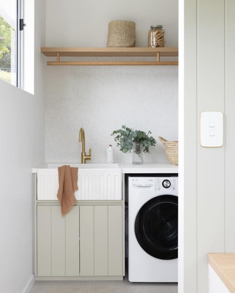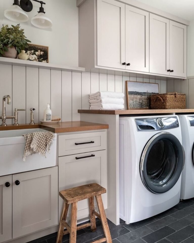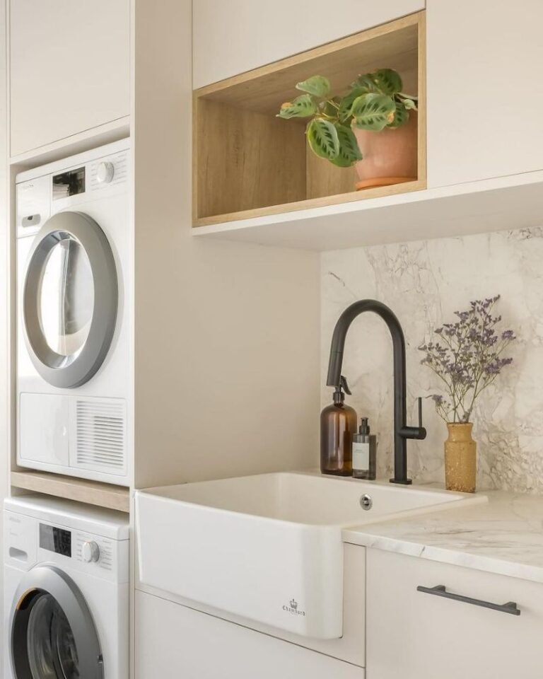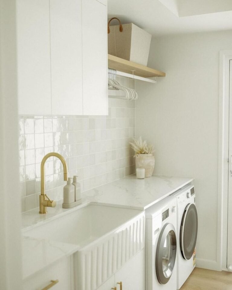 If you aren’t using a deep farmhouse sink, you’re making life harder. Hand-washing delicates or soaking muddy sneakers becomes ten times easier. Plus, pairing a white sink with matte black hardware is a total design flex.