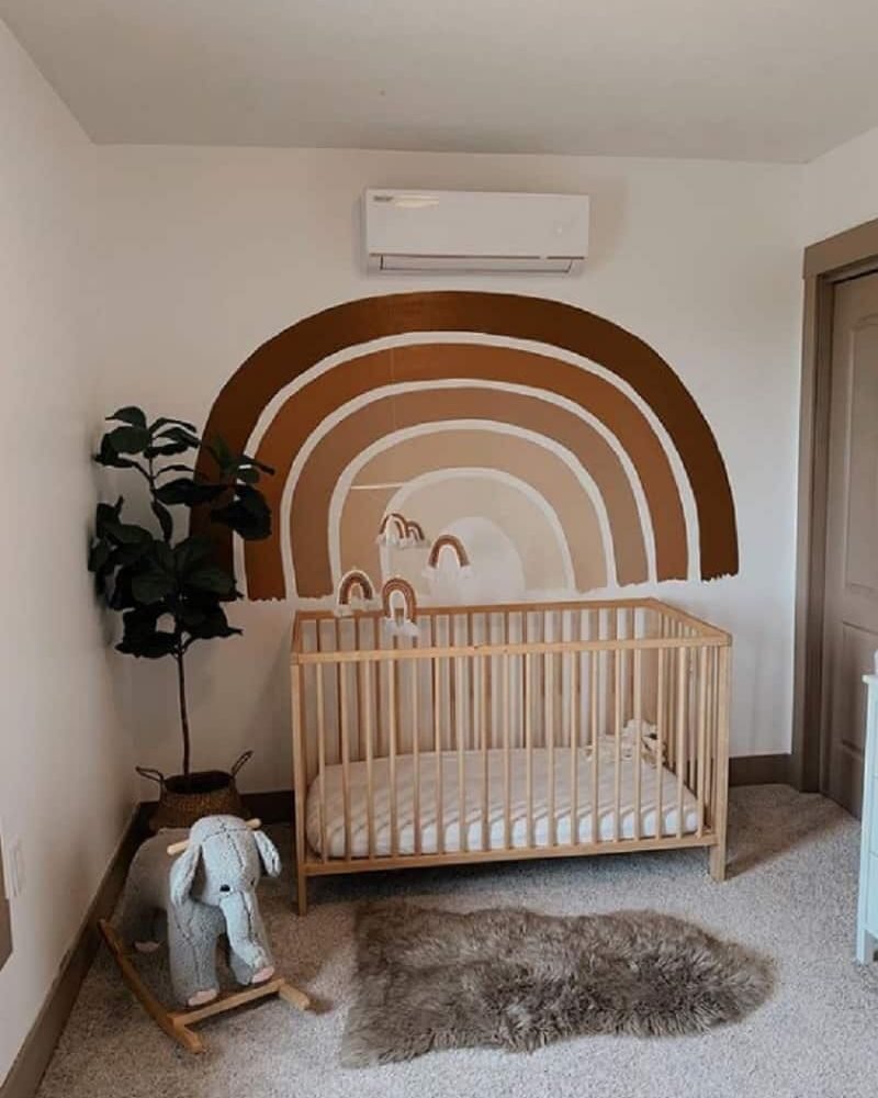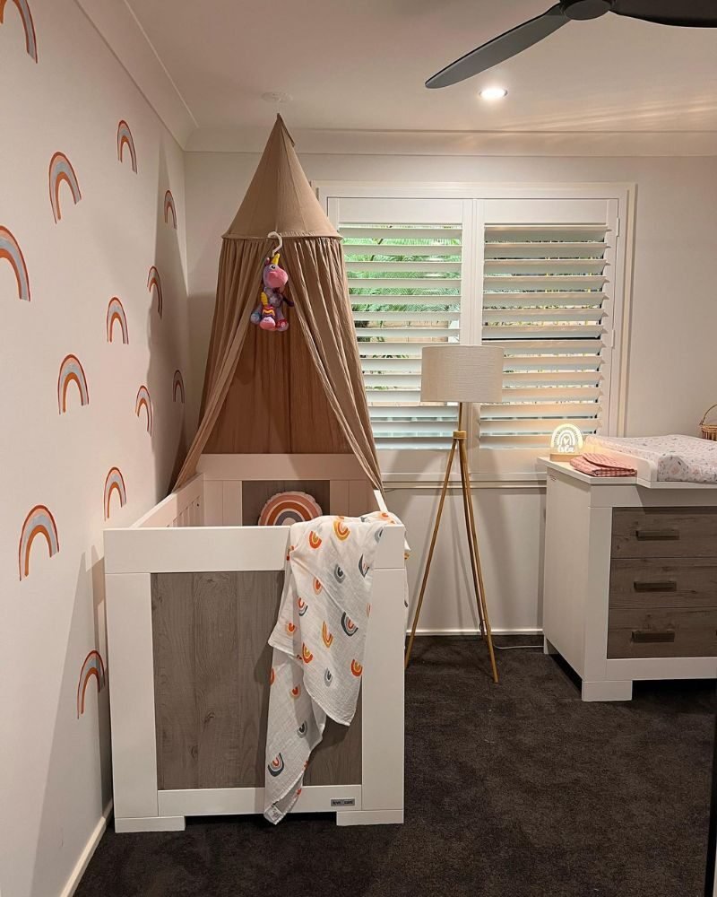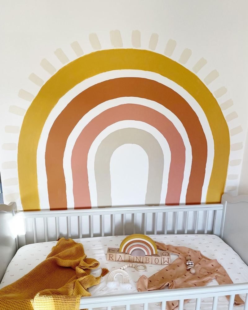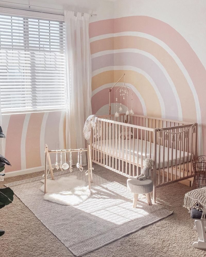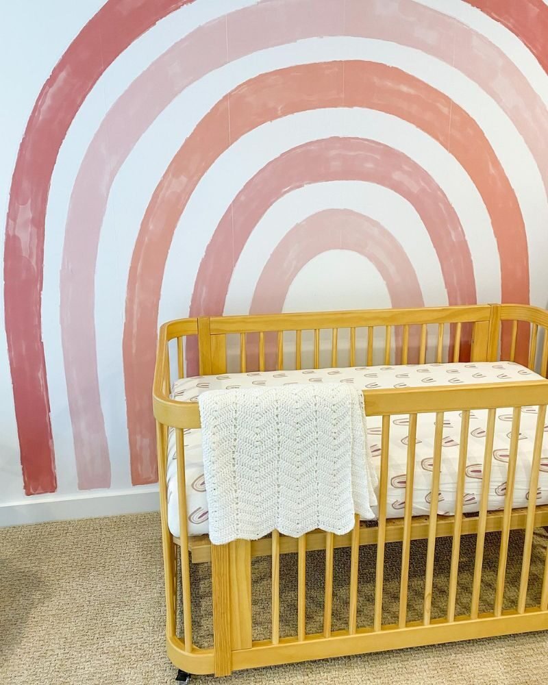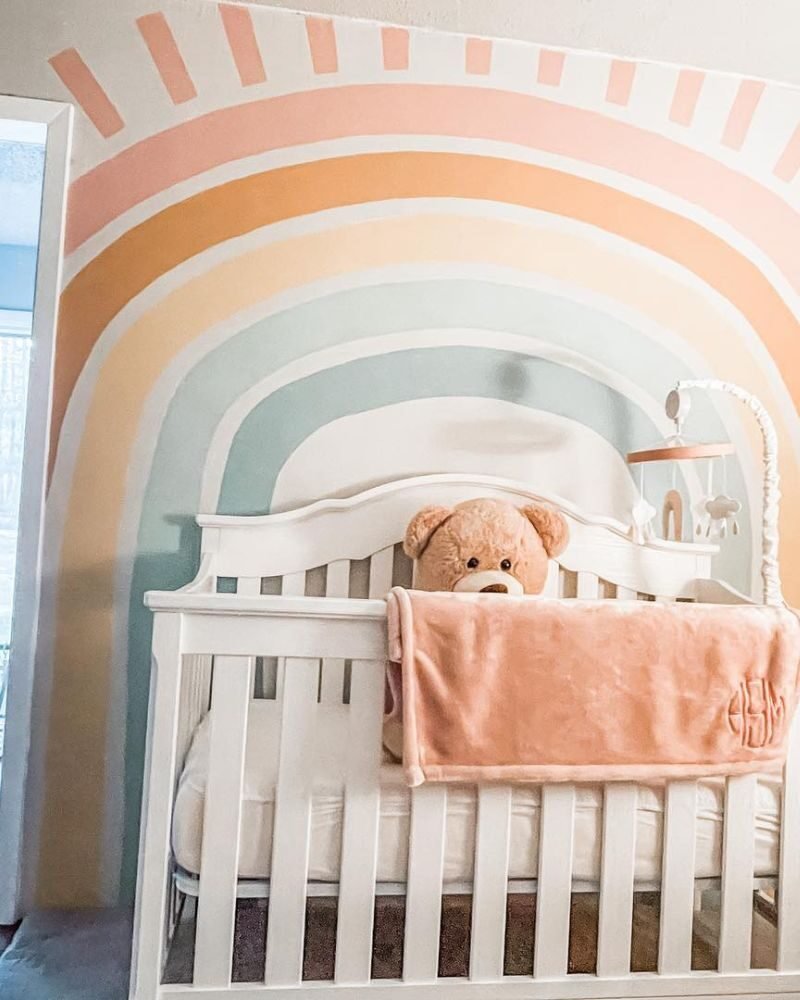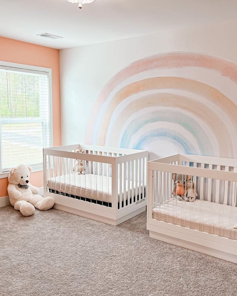 If you’re prepping for two, a soft peach-toned rainbow creates a unified look that works for any gender combo. It keeps the room feeling balanced and calm, which you’ll definitely need with twins!