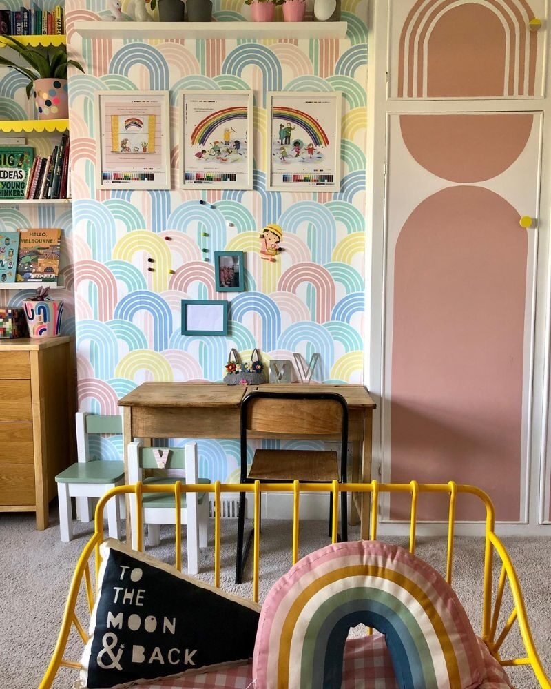 Add some sun rays peeking out from behind a pastel rainbow. It’s the ultimate “good morning” vibe for a room, even if you’ve been up since 3 AM.