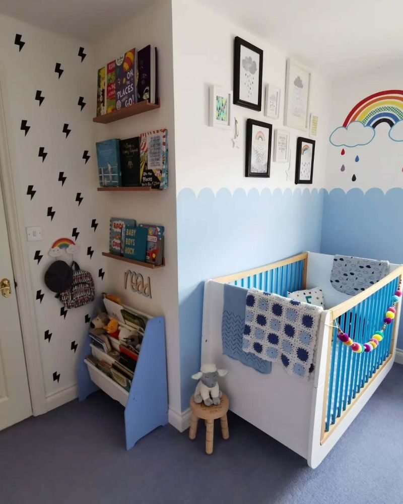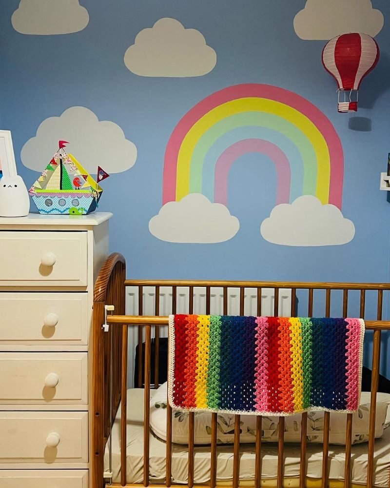 Focus on blues and grays, then pop a gentle rainbow in the middle. Add some cloud-shaped pillows and a chunky knit blanket for the ultimate “dreamy sky” feel.
